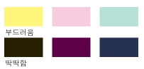 딱딱한(Hard) 이미지는 견고하고 중후하며 깊은 색채 이미지로 남성적이면서 점잖은 배색입니다. 저명도, 저채도를 중심으로 한 무게감을 지난 색상을 배색하고 견고하고 중후한 이미지를 전달할 수 있습니다.